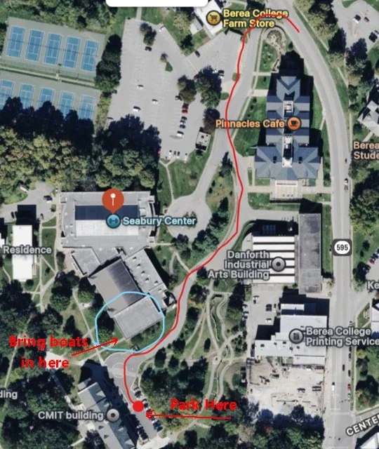 We will be rolling in the Gunkler Natatorium (fancy word for a pool) in the Seabury Center at Berea College. (see map link). NOTE: No need to pay at the door. This session is FREE. Just come around the left to the back door with your CLEAN boat and come on in. (See map below).