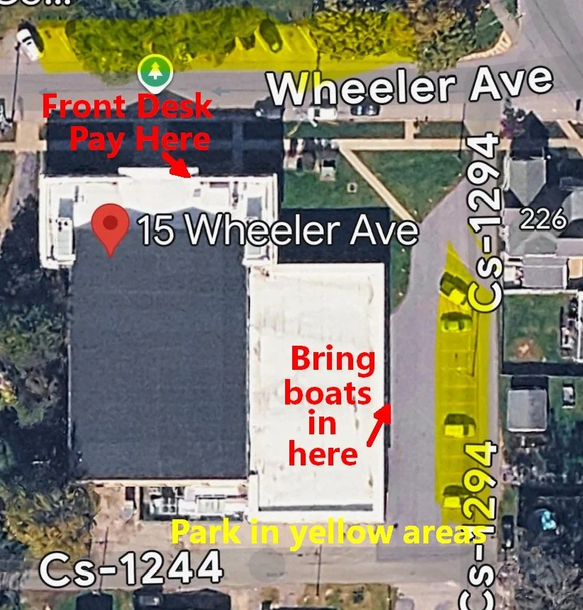 WHERE? The Clark County Parks and Rec Center (AKA the College Park center) where the staff is warm and so is the pool. Click on the map link for directions. Admission is $10 per person. Drop your boat off by the pool doors (picture below) and go up to the front desk (pool is one level down) to pay before coming into the pool. Front desk and pool entrance shown in red below. You can park in any of the yellow areas. Make sure your boat is clean and contact us at info@BluegrassWildwater.org if you need to borrow gear.